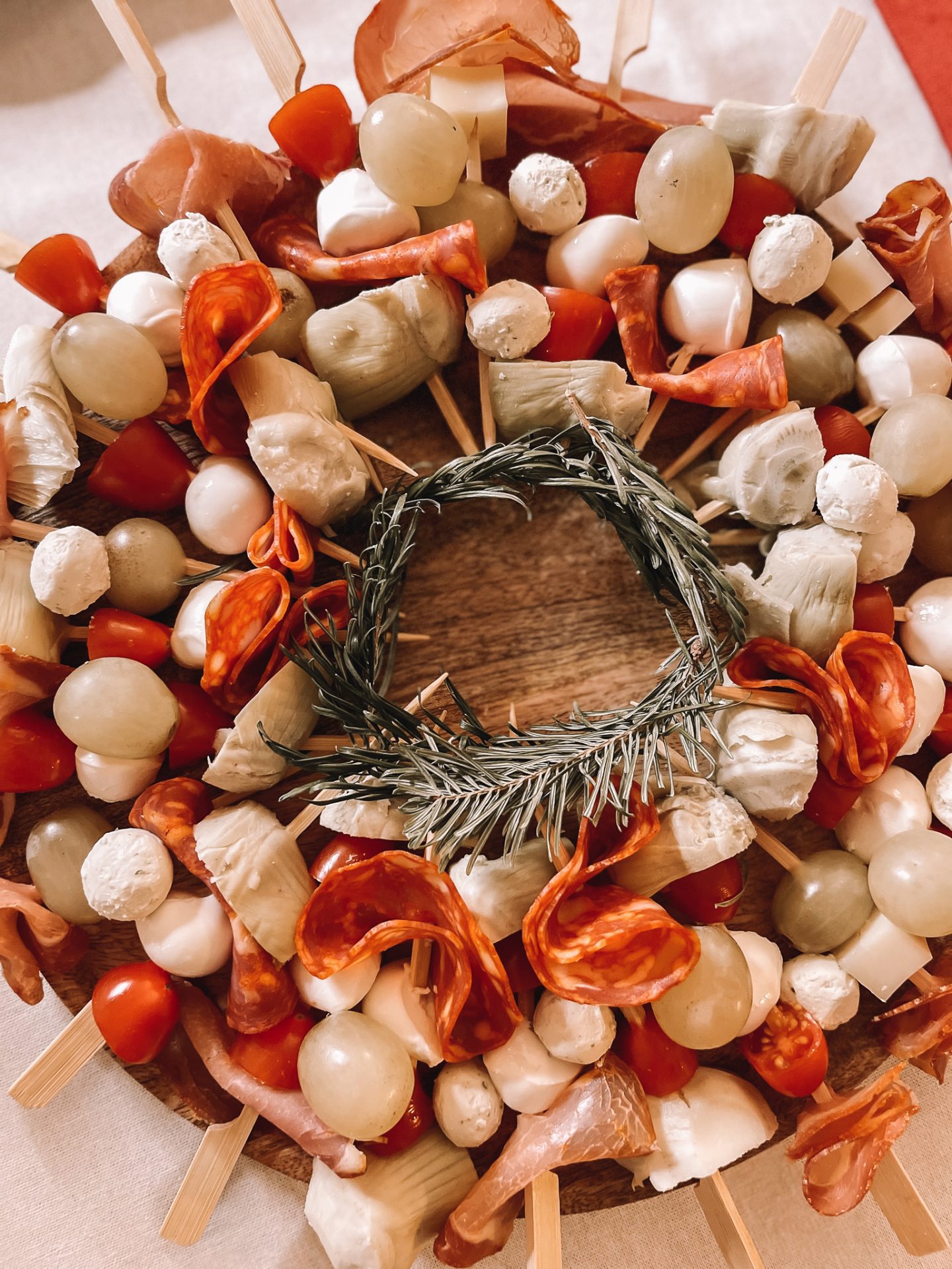 Maintenant, en termes de montage de la couronne, c’est en fait beaucoup plus facile qu’il n’y paraît. Vous allez sélectionner les ingrédients que vous souhaitez utiliser et les disposer en ligne afin de visualiser ce que vous avez. Vous embrocherez chaque ingrédient en créant différentes variantes. Disposez-les sur un grand plat en cercle, j’ai parfois fait deux couches, puis j’ai rajouté des billes de Saint Môret au thon et des raisins sur le dessus afin d’avoir cet aspect et cette sensation de «couronne» touffue.